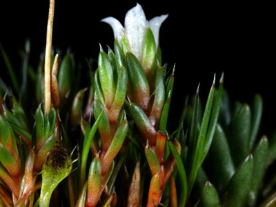 Cushion-forming, dark green to green plant of tussock grasslands, cushion bogs and heaths. Cushions 100 × 30 mm, leaves tightly overlapping, 2.8–4.5 × 0.5–0.9 mm, linear-oblong, concavo-convex with pale glass-like margins and prominent, pale hair like tips. Flowers white, bell-shaped