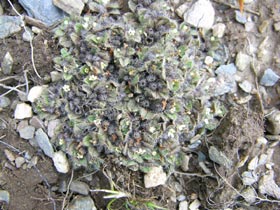 Decumbent, annual or rarely short-lived perennial herb, forming small circular patches on open ground. Rosette-leaves 15 × 5 mm long (sometimes more), lamina obovate or broadly spathulate, obtuse, petiole broad; upper surface hairy except towards base, undersurface almost or quite glabrous, hairs of upper leaf surface tapering to soft ± flexuous tips; spreading Lateral branches up to 8, decumbent, 30-150 mm long, usually branched, internodes usually less than leaves. Stem-leaves similar to rosette-leaves near base, becoming sessile above, bracts ovate to broad-oblong, distichous, exceeding internodes, diminishing in size, the lowest up to 10 × 5 mm. Cymes usually simple, few- to many-flowered, bracteate throughout; internodes usually less than bracts, sometimes very short; pedicels much smaller than calyx, very hairy. Calyx 3-5 mm long, usually lobed to halfway, lobes subacute; hairs long and ± retrorse short, not stiff or hooked. Corolla 3.0 mm diameter, cream to lemon-coloured, tube 2-3 mm long, cylindric, lobes narrow with obtuse tip; filaments very short, anthers < 1 mm long, wholly included, tips occasionally reaching level of scales; style less than calyx in length, stigma capitate. Nutlet 1.1-1.7 × 0.8-1.0 mm, ovate to ovate-elliptic, black, usually well immersed within calyx remnant.