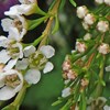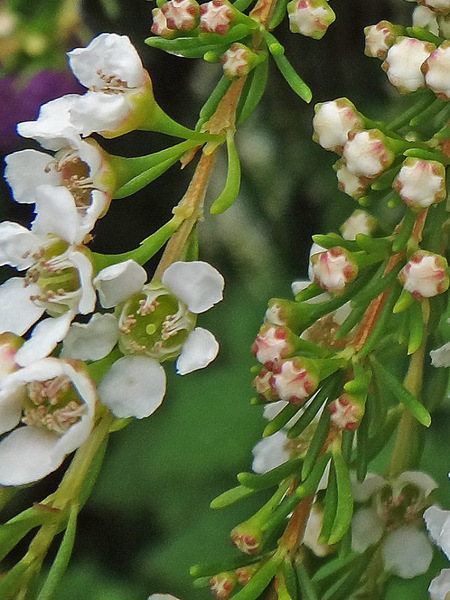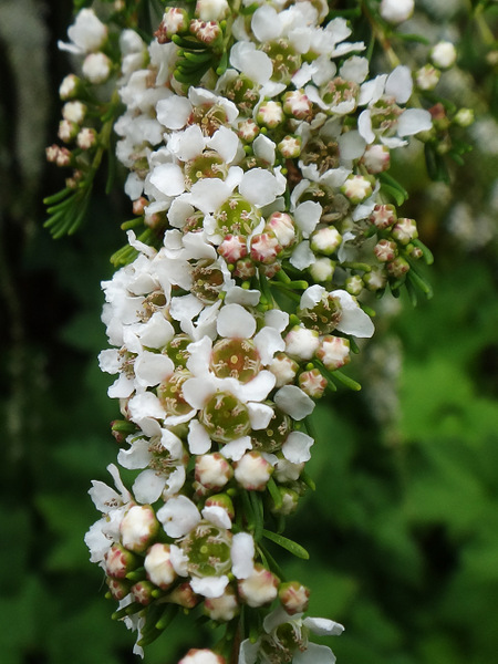 This plant has Leptospermum like flowers and is flowering mid-December. About 2 m in height. Growing in New Plymouth.